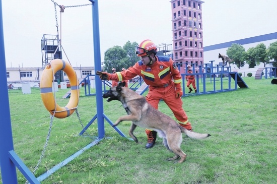 “坐下、卧倒、开跑!”日前,在荆州经开区消防救援大队搜救犬分队,消防救援队员正在训练马里努阿犬。