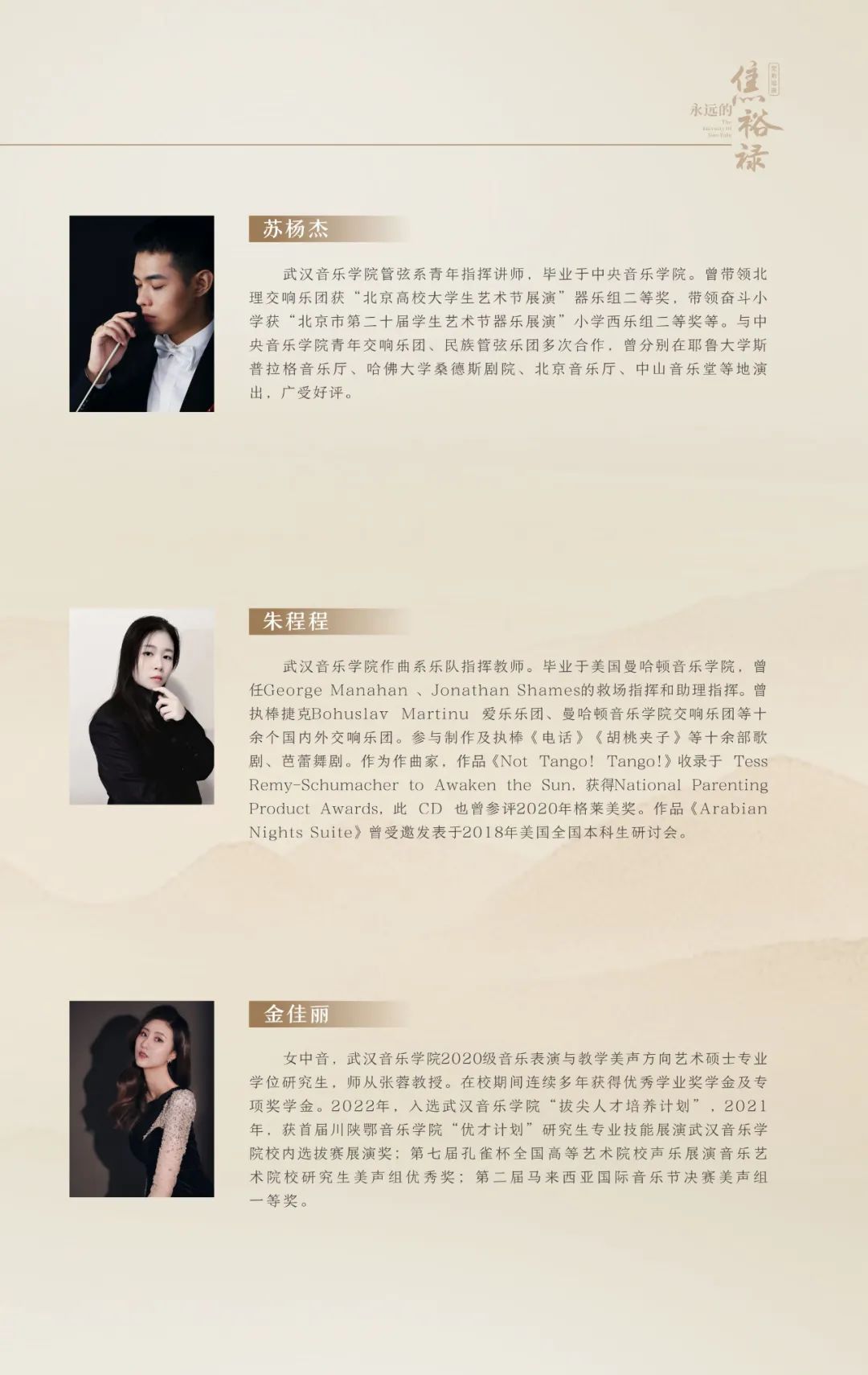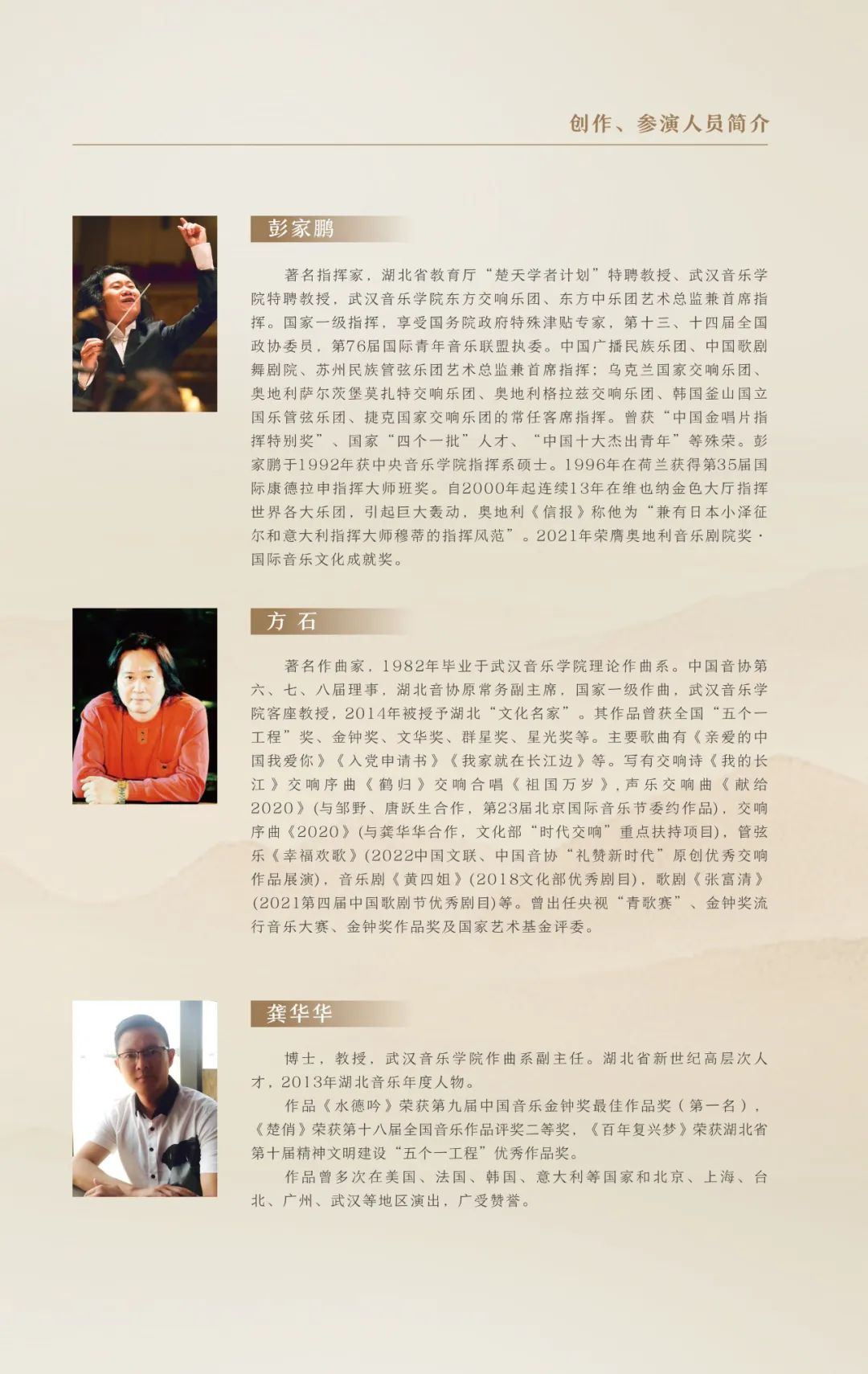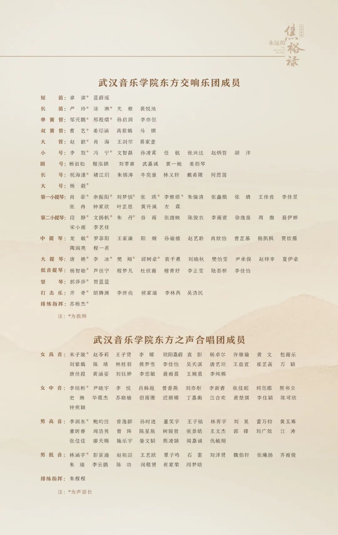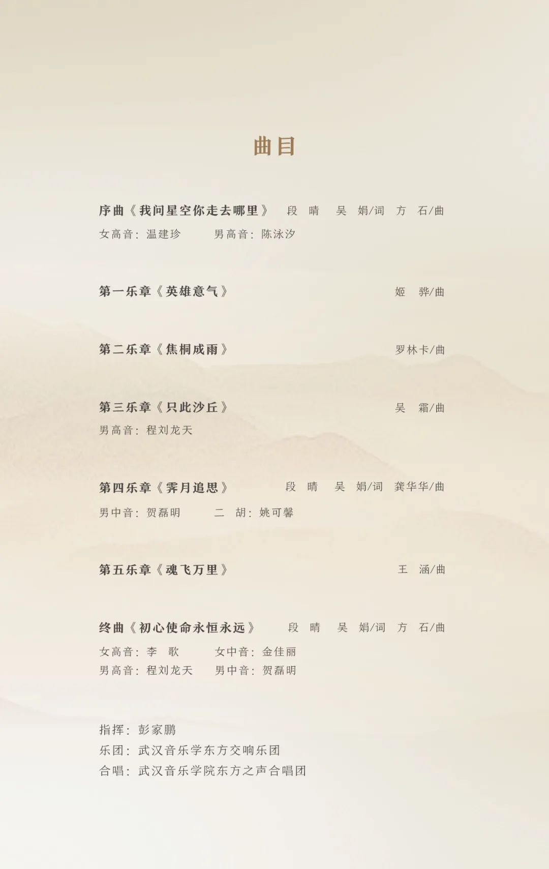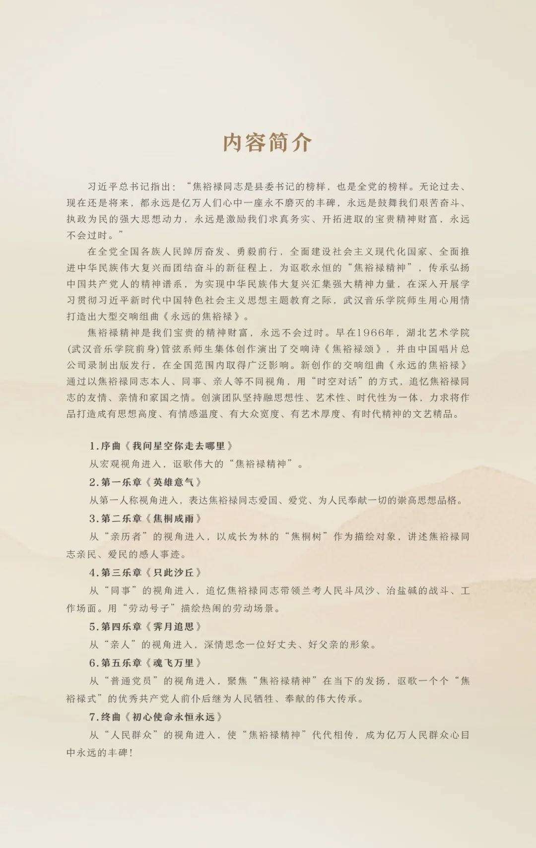 大型原创交响组曲《永远的焦裕禄》由著名指挥家彭家鹏指挥,武汉音乐学院东方交响乐团、武汉音乐学院东方之声合唱团联袂演出。通过以焦裕禄同志本人、同事、亲人、普通党员、人民群众等不同视角,采用“时空对话”的方式,追忆焦裕禄同志的友情、亲情和家国之情。