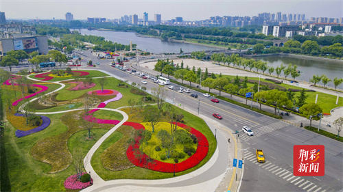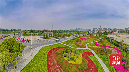 5月15日,航拍位于荆州古城东门景区东侧的轴承厂公园,各色鲜花姹紫嫣红,缤纷盛开,如彩虹带一样美不胜收。