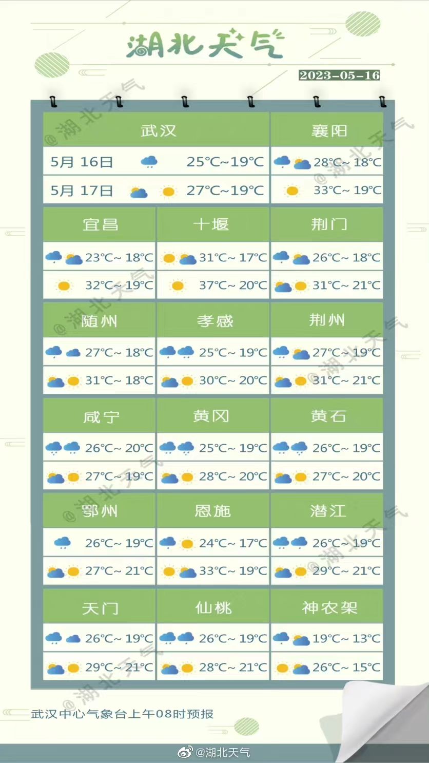 16日晚上:鄂东南、鄂东北东部阴天有小到中雨,局部大雨并伴有雷暴大风、短时强降水等强对流天气;鄂西北、鄂西南多云到晴天;其他地区阴天有阵雨。