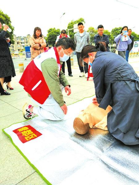 近日,曾都医院红十字会积极参与由市、区红十字会联合举办的纪念第76个世界红十字日宣传服务活动,志愿服务队队员现场进行了单人徒手“心肺复苏”的演示和培训,让更多的人了解和实操掌握了“心肺复苏”技能。 (随州日报通讯员 张厚琪摄)