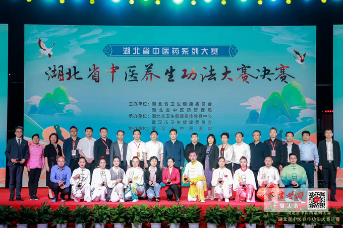 秦楚网-十堰头条讯 文、图/记者 张贞林 特约记者 李毅 报道:4月20日,2022年度湖北省中医养生功法大赛决赛在武汉落下帷幕,十堰市国药东风总医院代表队荣获三等奖。十堰市卫健委党组成员、副主任严彬,中医科科长李乐东,国药东风总医院院长魏涧现场指导。