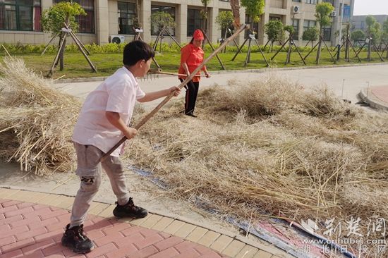 经过几天的曝晒,油菜壳已经非常干脆,菜荚里的菜籽“呼之欲出”。5月16日,永河小学组织部分学生开展“大豆脱粒”劳动实践活动。