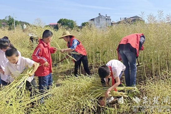 荆楚网(湖北日报网)讯(通讯员刘志勇)“田间少闲月,五月人倍忙”。转眼间,红安县永河小学劳动实践基地里的油菜进入收获期,5月12日,永河小学各班师生趁着晴好天气抢收油菜,现场一派繁忙的丰收景象。