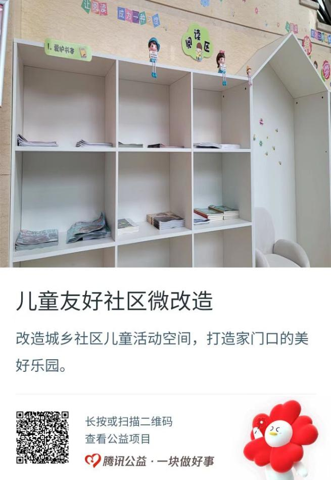 关爱儿童就是守护未来。“儿童友好社区微改造”项目旨在将“一米高度”视角落实到城乡社区建设中,对社区进行美育空间微改造、阅读空间微改造、自然空间微改造、议事空间微改造、社区出行微改造以及其他符合儿童需求的空间微改造,并面向儿童、家长常态化开展安全自护、假期托管、科普讲座、文体活动、亲子阅读等各类公益服务,为儿童成长与发展创造更好的社区环境。