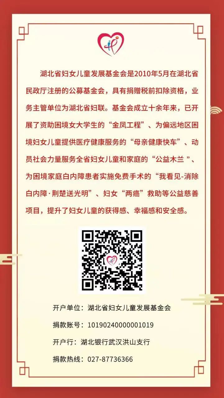 人人公益,温暖人人;幸福生活,共同缔造。真诚希望有更多爱心单位、爱心人士关心支持妇女儿童公益慈善事业,让每一位妇女都有人生出彩和梦想成真的机会,让广大儿童共享湖北经济社会发展的成果!