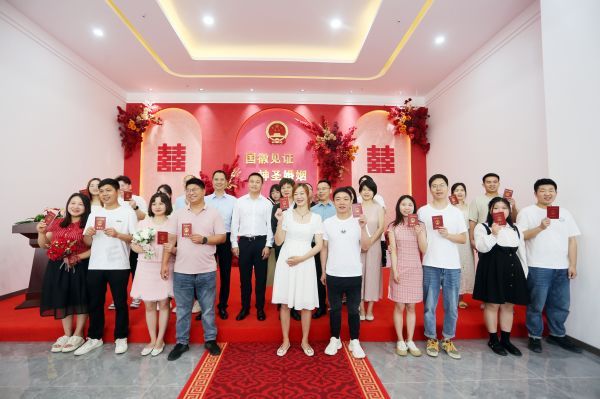 当天,掇刀区婚姻登记处举办了第二届“520”结婚登记集体颁证仪式,10对新人一并登上舞台,掇刀区民政局相关负责人为他们颁发结婚证,新人们在领证台上,共宣誓言喜结良缘。