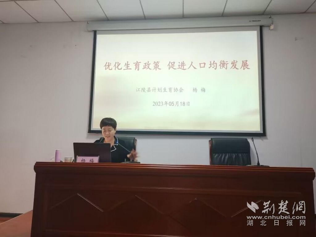 荆楚网(湖北日报网)讯(通讯员沈蓉、李文)5月18日下午,江陵县计划生育协会常务副会长杨梅受县委组织部安排,到县委党校为2023年青年干部主体班开展以“优化生育政策促进人口长期均衡发展”为主题的专题培训。课程从中国生育政策演变历程、我国当下的人口国情、江陵县计划生育工作现状、如何做好新时代人口工作等四个方面对计划生育工作做了分析和讲解。