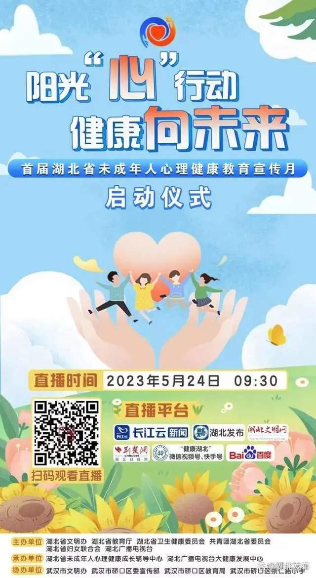 由湖北省文明办、省教育厅、省卫健委、团省委、省妇联、湖北广播电视台联合主办的“阳光心行动 健康向未来”首届湖北省未成年人心理健康教育宣传月将于5月24日正式启动。旨在进一步深化未成年人心理健康教育工作,营造守护未成年人心理健康成长的良好氛围。