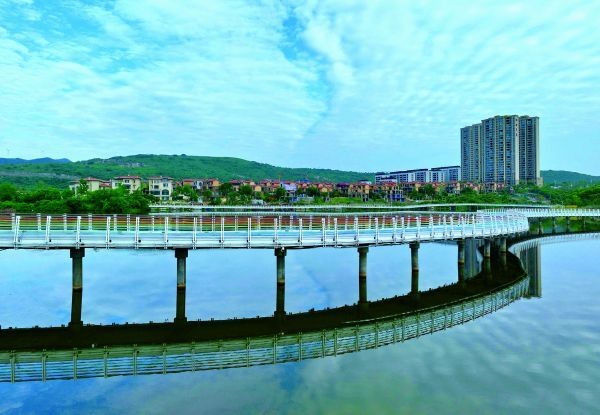 5月23日上午,雨后的东宝区龙凤山公园,水面平静得犹如一面镜子,周边的亭台楼阁、廊桥和蓝天白云倒映水面犹如“天空之镜”,吸引了不少市民前来打卡。龙凤山公园是东宝区重点打造的民生工程,集生态旅游、文化休闲于一体,是城北居民重要的休闲、健身场所。(记者 朱俊波 通讯员 刘嫣 摄)