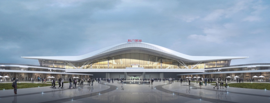 荆门西站选址于荆门市规划的漳河新区内,以“环荆之翼,临风起航,云水相依,月映千里”为理念设计,站房建筑总面积约4万平方米,设计旅客流量3000人,5站台13线,计划2024年6月竣工。站房为三层,地下出站层、地上站台层和高架候车层,局部设有设备及商业夹层,建筑总高度35.8m(最高点)。