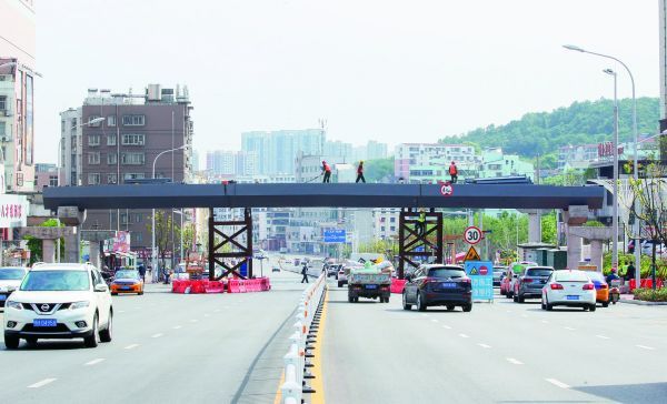 5月23日,荆门城区白云大道白云路小学门前人行天桥正在紧张建设中,天桥建成后可有效缓解行人通行压力。(记者 郑波 摄)