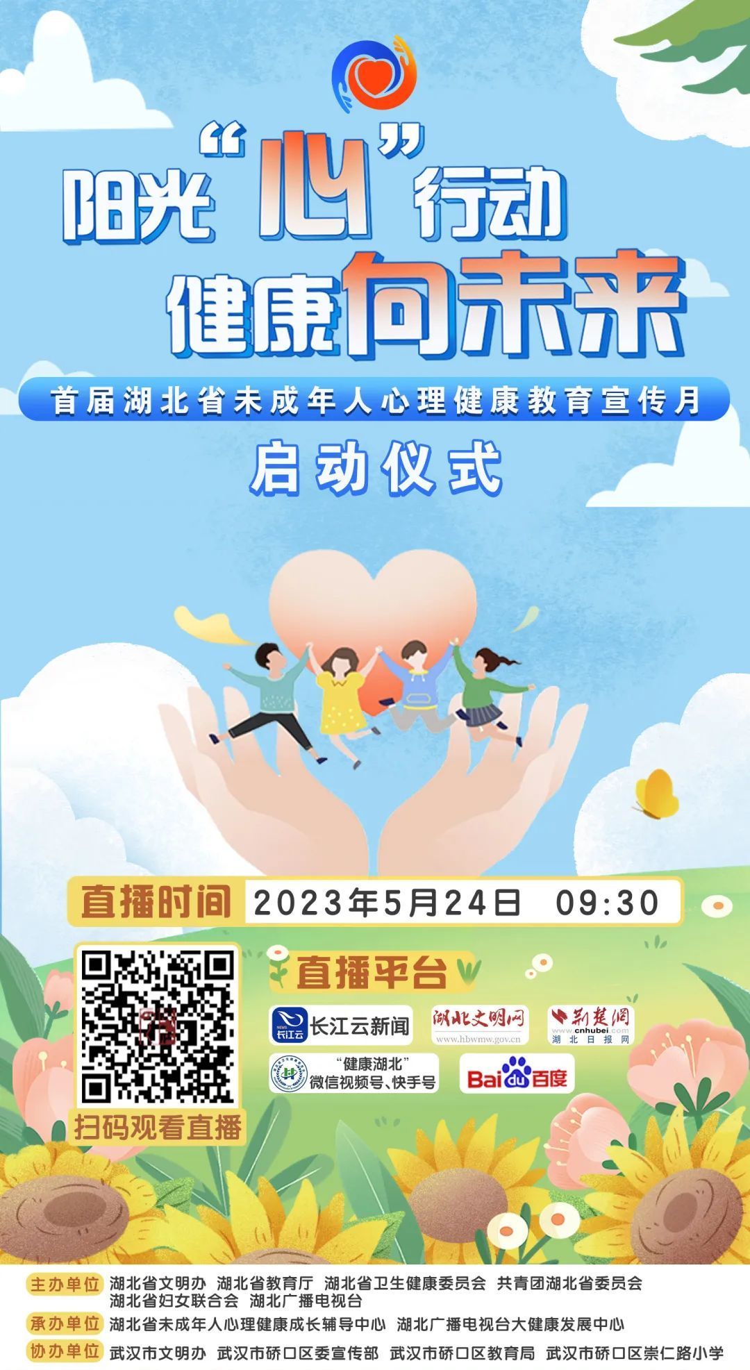 为了积极响应《全面加强和改进新时代学生心理健康工作专项行动计划(2023—2025年)》,推进湖北省未成年人心理健康教育工作,推动学校、家庭、社会三方发挥协同作用,营造守护未成年人心理健康成长的良好氛围,5月24日,湖北省文明办联合省教育厅、省卫健委、团省委、省妇联、省广播电视台在武汉市硚口区崇仁路小学举办“首届湖北省未成年人心理健康教育宣传月”活动启动仪式。