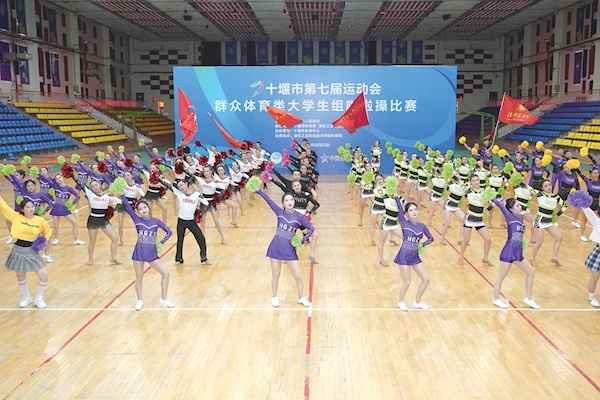 武汉体育学院武当山国际武术学院啦啦操队动感十足。