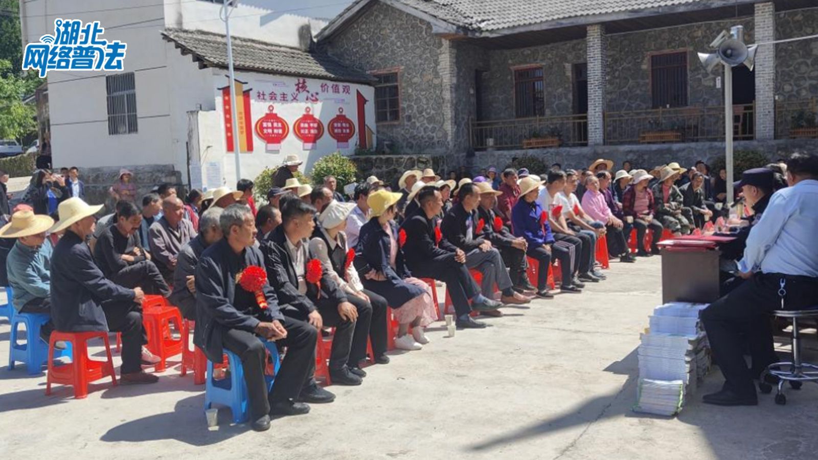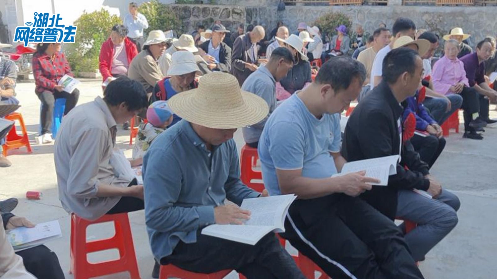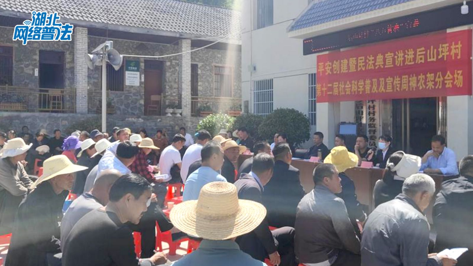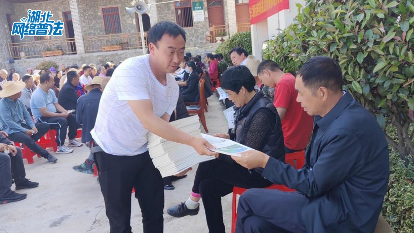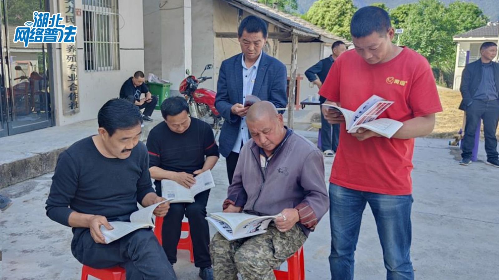 5月24日下午,在绿水青山环绕着的神农架林区,湖北网络普法走进宋洛乡后山坪村村委会的院坝里,村民们围坐在一起,边看手里的宣传资料,边听普法宣讲。