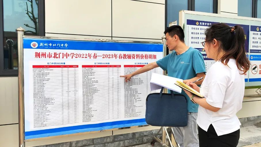 ▲图为荆州区纪委监委专项督导组对北门中学教辅材料征订情况进行监督检查