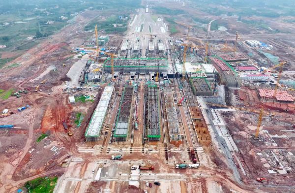 荆门西站是沿江高铁、荆荆高铁、襄荆高铁并站的一座大型高铁枢纽站,造型取自“凤舞荆楚,振翅高飞”,以舒展流畅的曲线造型,融合荆门本土地域特色,凸显荆门航空文化,一飞冲天的姿态,表达出强劲的发展动势。荆门西站建设整体分为基础出站层(地下层)、进站层(地面层)和高架候车层(地上层),目前站房基础出站层主体结构完成100%,进站层主体结构完成90%,承轨层(跨线)主体结构完成100%,站台雨棚主体完成65%,已全面进入高架候车层主体施工阶段。