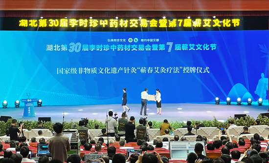 授予国家级非物质文化遗产针灸“蕲春艾灸疗法”牌匾。阮琼 摄
