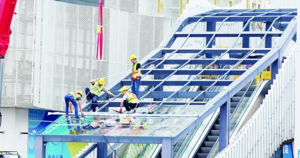5月25日,工人正更换荆门中心城区象山大道中商百货旁人行天桥上的玻璃,消除安全隐患,确保行人安全。(记者 郑波 摄)