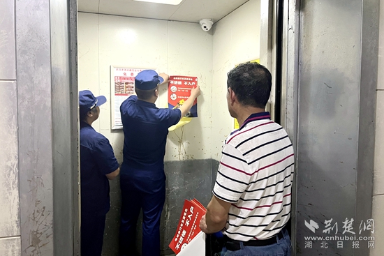 对此,检查人员要求物业管理单位要积极通过业主群发送安全警示、入户宣传提示等方式加强宣传教育,同时加强日常巡查检查,及时消除隐患。随后,检查人员和物业人员在小区宣传栏、电梯内、楼道口等位置张贴电动车消防宣传海报,提示居民规范使用电动车。