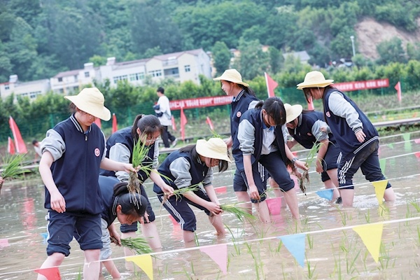 “每一次插秧需要取下3至5株秧苗插入田中,并且横竖对齐……”现代农业生态园内,在农田负责人的带领下,学生们卷起衣袖、脱去鞋袜、卷起裤脚,埋头弯腰下田插秧,沉浸式体验农耕文化。
