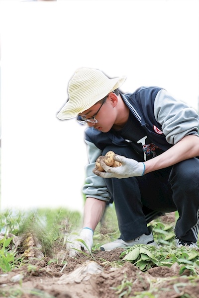 随后,在老师们的带领下,学生们拿好挖土豆的工具,来到土豆种植园,分组挖起了土豆。几锄头刨过,一个个外形饱满的土豆破土而出,分工明确的同学们忙着进行分拣、装袋,不一会儿,一袋袋沉甸甸的土豆堆满田间地头,现场一派热火朝天的丰收景象。