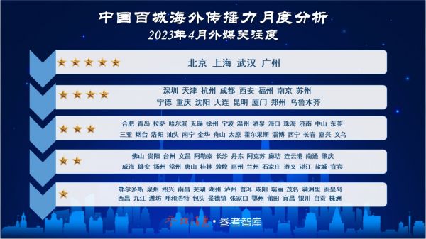 《中国百城海外传播力之外媒关注度月度分析报告(2023年4月号)》报告显示,境外媒体4月关注度最高城市为北京、上海、武汉、广州等地,武汉再度位列TOP3。