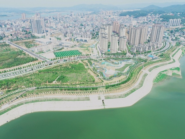 5月25日,空中俯瞰新建的郧阳区城关镇外滩公园,碧水如玉、风景如画。面积达万余平方米的外滩公园是郧阳湖北岸生态护岸景观工程规划建设的一部分,栽植景观树木1.88万株、地被植物38.8万平方米,修建休闲游步道1.07万米、自行车道1.12万米、广场2.74万平方米、公园8.96万平方米、停车场1万平方米。特约记者王涛摄