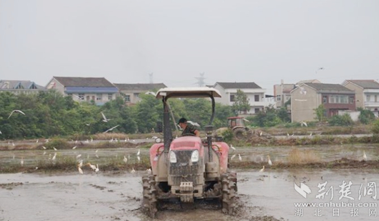 水田中,打田机来回穿梭,工人们在忙着灌水、播种,到处都是一片生机勃勃的繁忙景象。一群群白鹭鸟在人与机器之间飞来飞去嬉耍,织就出一幅喜乐祥和的图画。