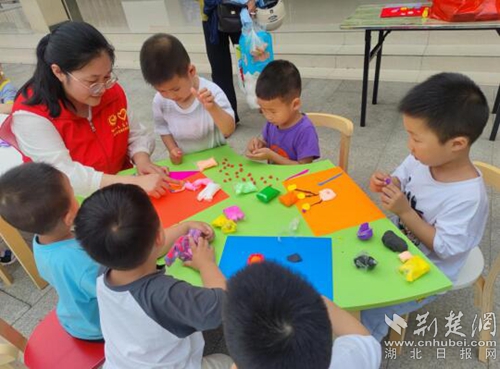 活动现场,志愿者们带领孩子们做起了趣味小游戏。随后的手工活动环节,志愿者和孩子们一起绘画、捏塑。欢声笑语中,一个个色彩缤纷、造型各异的作品在孩子们指间成型。