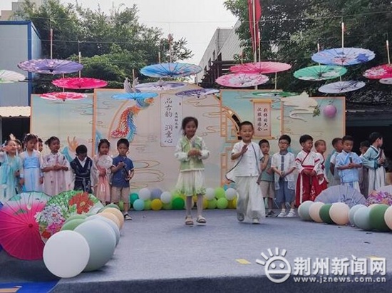 合唱《唱脸谱》、舞蹈《孩子的天空》、情境表演《普罗米修斯》等精彩的文艺节目轮番上演,沙市北京路第三小学的孩子们身穿各种特色服装,用心演绎着经典故事,用歌声庆祝着自己的节日。校园内,还展示着学生们手工制作的服饰、围巾、精美花束、扇面画等艺术作品,营造出浓浓的六一氛围。