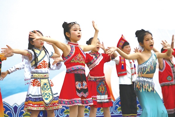 重庆路小学学生着少数民族服饰载歌载舞。