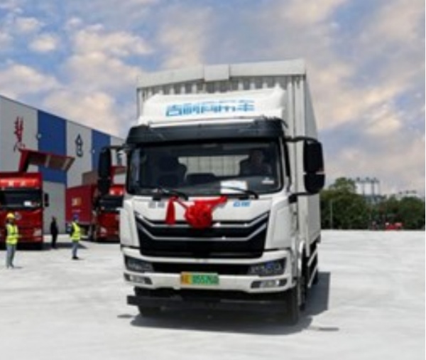 该批新能源货车采用纯电力驱动,拥有荆门亿纬工厂制造的“亿纬心”动力电池。新能源货车满电行驶里程可达160多公里,充电时间30分钟左右,电池容量基本满足重型厢式货车中短途运输需求。