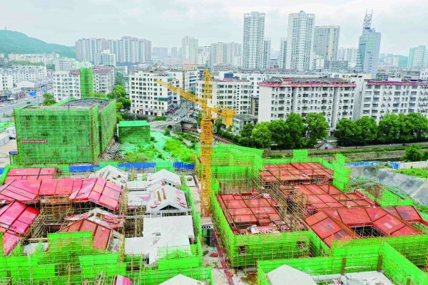 5月30日,记者在文化宫片区改造项目现场看到,部分房屋建筑群已初具形态,正在进行主体结构施工。据项目方介绍,该项目正有序推进,规划了文化宫主楼、啤酒博物馆、商业街和停车场等区块,改造后将集历史文化记忆、传统民艺民俗、地方小吃特产、地方戏曲表演及旅游生活休闲于一体,成为荆门历史文化特色街区。(记者 张彩云 摄)