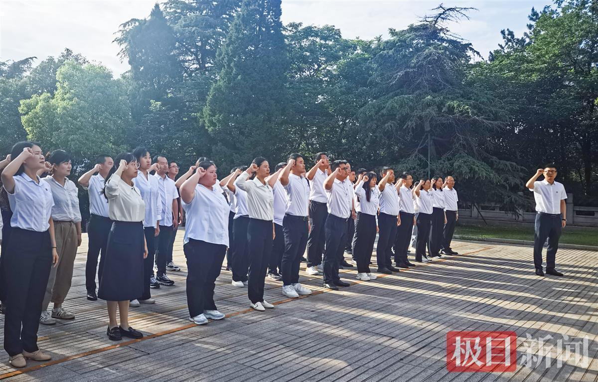 在鄂豫边区革命烈士陵园,全体党员肃立在革命烈士碑前,重温入党誓词,接受党性洗礼,汲取前进动力。