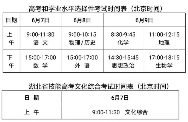 考试分3天进行。其中:6月7日考语文、数学、技能高考文化综合;6月8日考物理(或历史)和外语,6月9日考思想政治、地理、化学、生物学(考生选择的其中两科)。语文和技能高考文化综合考试时长为150分钟,数学和外语考试时长为120分钟,高中学业水平选择性考试各科考试时长为75分钟。