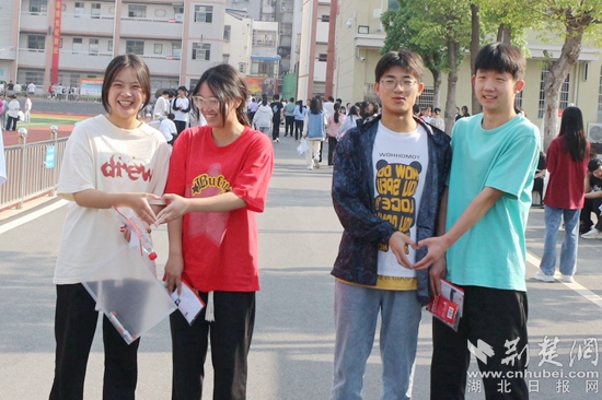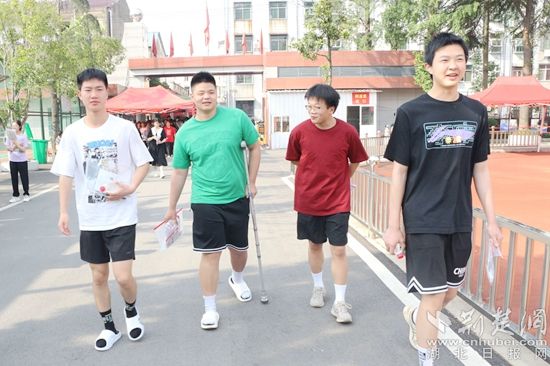 他们当中有的考生身穿红色衣服,预祝考试大捷;在进考场前,有的考生围在一起,摆出爱心的手势,露出自信的笑容,高呼“战胜高考,我能,我一定能”的口号响彻云霄;有的考生虽然在考前腿部或头部受伤,但他们没有显示畏惧的神态,反而展现了更坚强的毅力与一往无前的勇气,面带笑容,坚定地迈入考场……一幕幕从容的画面诠释着勇毅前行,一张张自信的笑脸展示着超越自我。