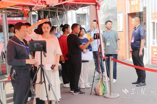 现场,考生排着整齐的队伍,接受考点身份验证及安检检查,陆续步入考场。