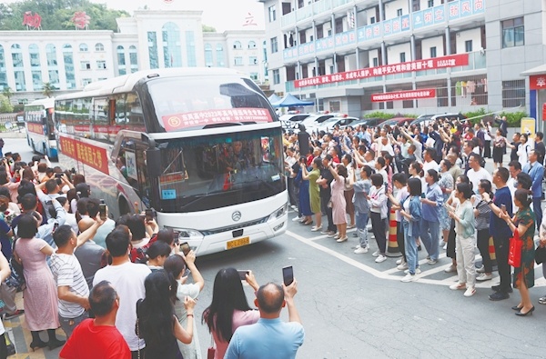 6月7日,2023年高考大幕开启,全市3.1万余名考生参加高考,我市积极开展“2023年高考护航行动”,全力以赴做好各项考务工作,确保高考安全有序进行。图为东风高中考生乘坐大巴前往考点。记者张启国摄