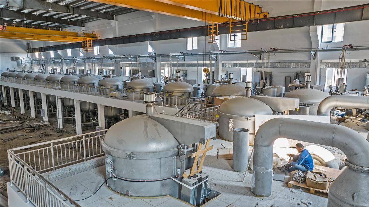 6月6日,荆州市湖北富春染织有限公司染色生产线上,工人正在调试设备,力争6月底试生产。该企业由芜湖富春染织股份有限公司投资10亿元兴建,项目建成后可年产6万吨高品质筒子纱,日产量可突破268吨,将成为富春染织在国内产能最大项目,能带动荆州纺织印染行业整体水平提升,也能带动本地印染、染色等配套企业发展。