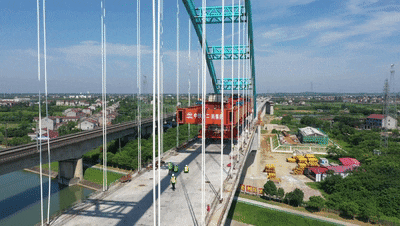 随着最后一条桥梁吊索张拉到位,今天上午9点左右,架桥机开始通过江汉运河特大桥。