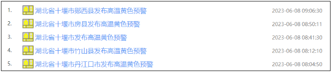 十堰市气象台今天(6月8日)08时42分发布高温黄色预警信号:预计未来72小时,十堰地区将有连续三天日最高气温在35℃以上,请注意防范。