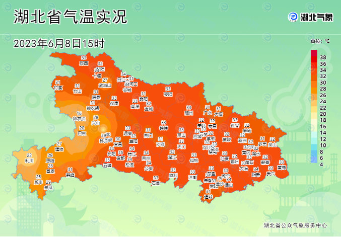 据湖北省气象局 ,预计未来三天,受高空偏北气流控制,省内大部分地区为多云到晴的天气,气温上升,高温将达33~36℃,局部会升至36℃以上。