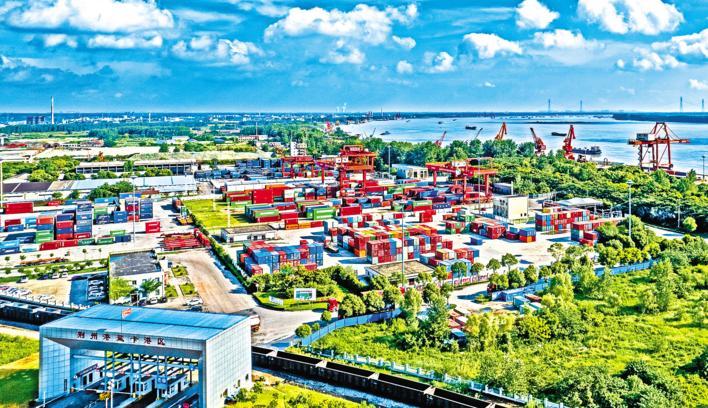 6月8日,长江荆州段碧水悠悠,过往船舶汽笛声此起彼伏。盐卡港码头上,红色门机将一个个集装箱缓缓吊起,稳稳地放到货轮上。
