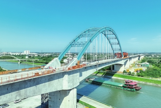 荆荆铁路江汉运河特大桥全长309.6米,设计采用连续梁拱跨越江汉运河,是全线的工期控制性工程。该桥梁的建成,不仅打通了全线架梁通道,也为荆荆铁路建成通车奠定了坚实基础。