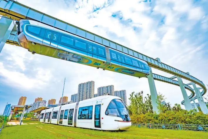 光谷空轨列车试车,与光谷量子号有轨电车相遇。(图:湖北日报/魏铼)