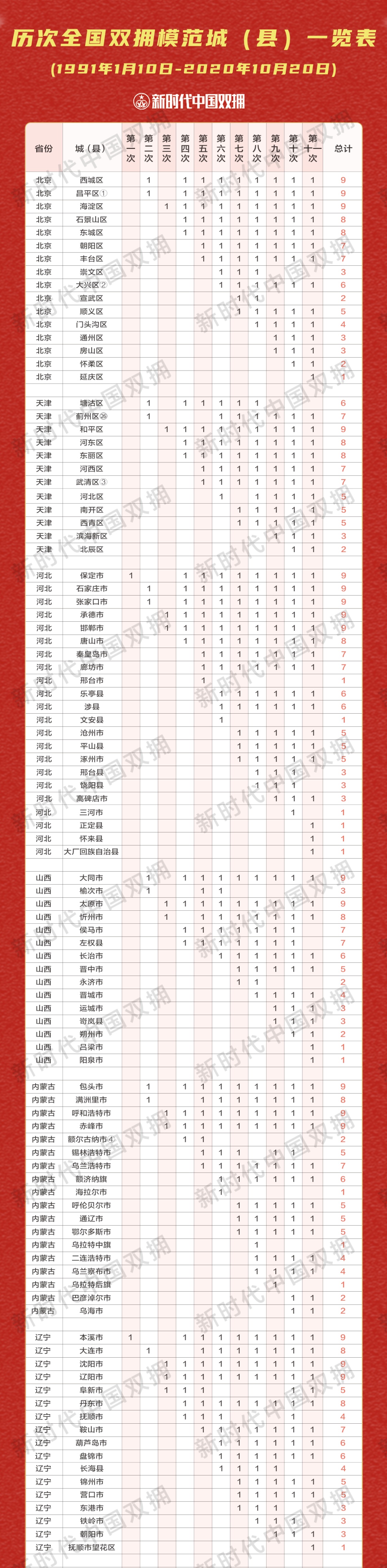 全国双拥模范城(县)创建活动自1991年开展以来,已经进行了11轮命名表彰,历次受表彰城(县)集纳成表正式发布。荆州市“三连冠”上榜,石首市和监利市也分别榜上有名。