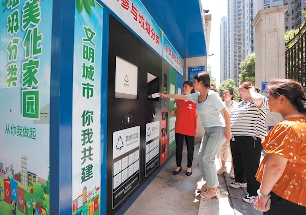 6月13日,张湾区汉江路街道阳光社区志愿者正为辖区居民讲解如何使用新增的智能垃圾分类回收设备。据了解,该社区引进6台智能垃圾分类回收亭,回收亭具有感应投放、扫码投放、推动投入、积分兑换等功能,其中积分兑换投放箱不仅能把废品变现,还提高了居民参与垃圾分类的积极性。同时,社区成立环保志愿服务队,每周开展科普志愿服务活动不少于4场,通过举办讲座、发放倡议书等方式,形成“垃圾分类、人人有责,全民参与、共创和谐”的良好氛围。记者 刘旻 摄