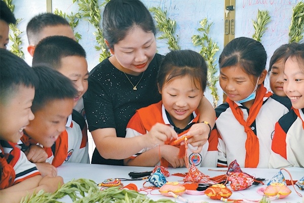 6月14日,郧阳区柳陂镇中心小学学生体验绣小香包。