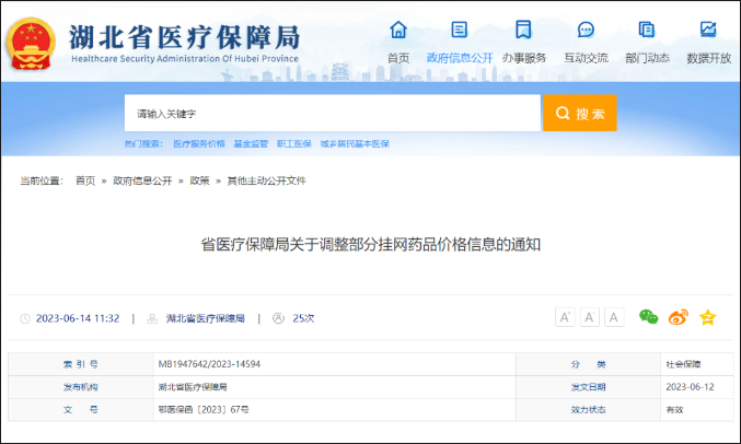 湖北28个挂网药品价格调整